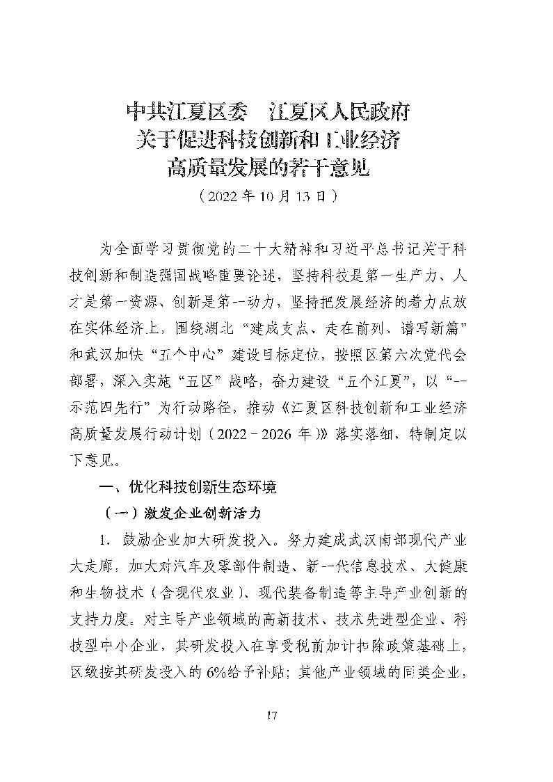 【通知】中共江夏區(qū)委 江夏區(qū)人民政府關于促進科技創(chuàng)新和工業(yè)經(jīng)濟高質量發(fā)展的若干意見